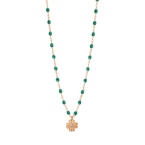 Clover Lumière necklace in 18 carat rose gold, with emerald resin pearls. Ribbed pendant in 18 carat rose gold set with a diamond.