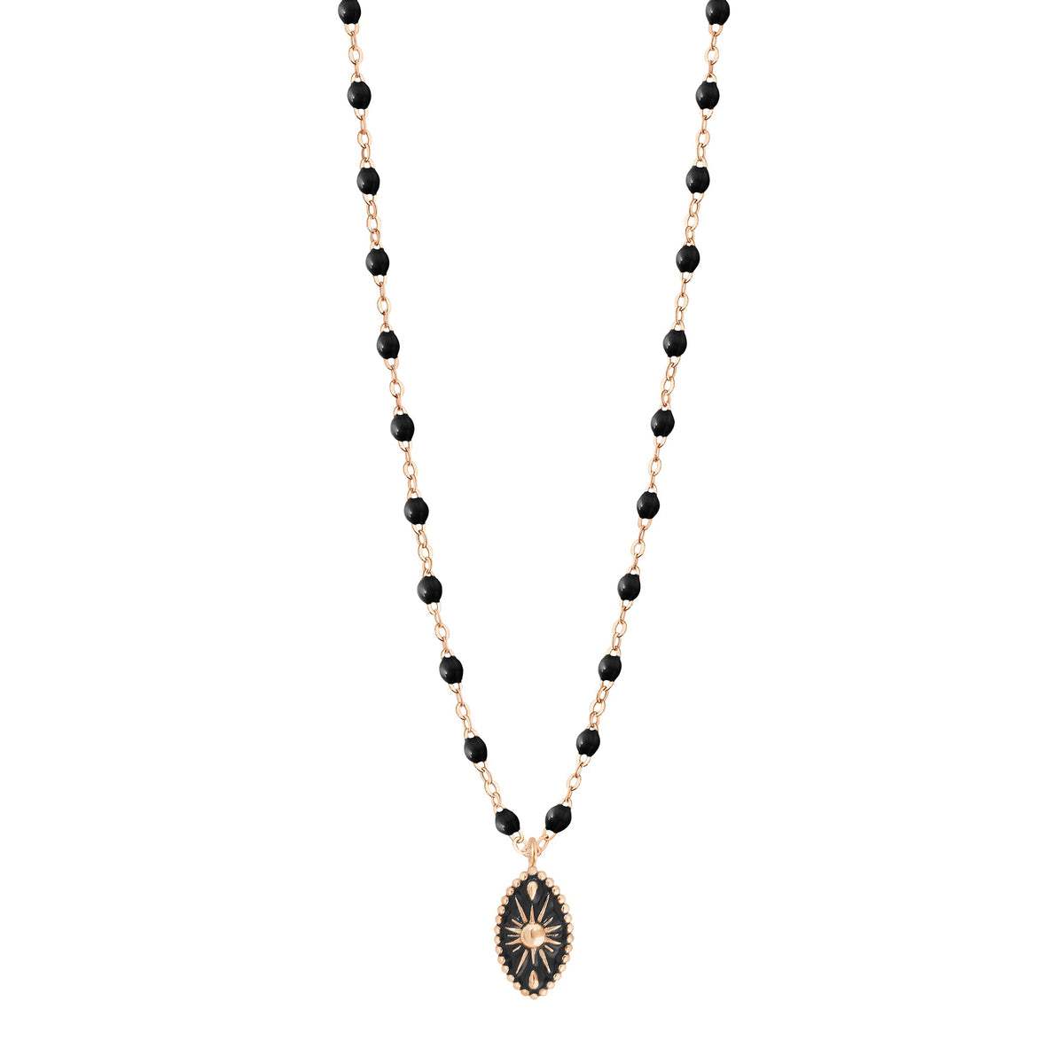 The Gigi Clozeau Karma necklace in 18 carat rose gold on a Classic Gigi chain, with elegant, Black pearls of resin. The perfectly placed, detailed pendant is a precious talisman, offering light and protection.