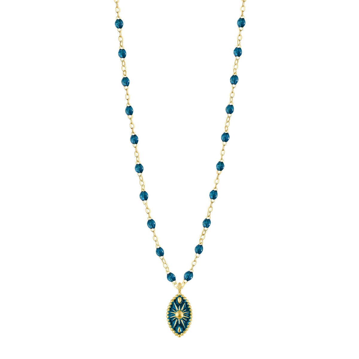 The Gigi Clozeau Karma necklace in 18 carat yellow gold on a Classic Gigi chain, with elegant, Jungle pearls of resin. The perfectly placed, detailed pendant is a precious talisman, offering light and protection.