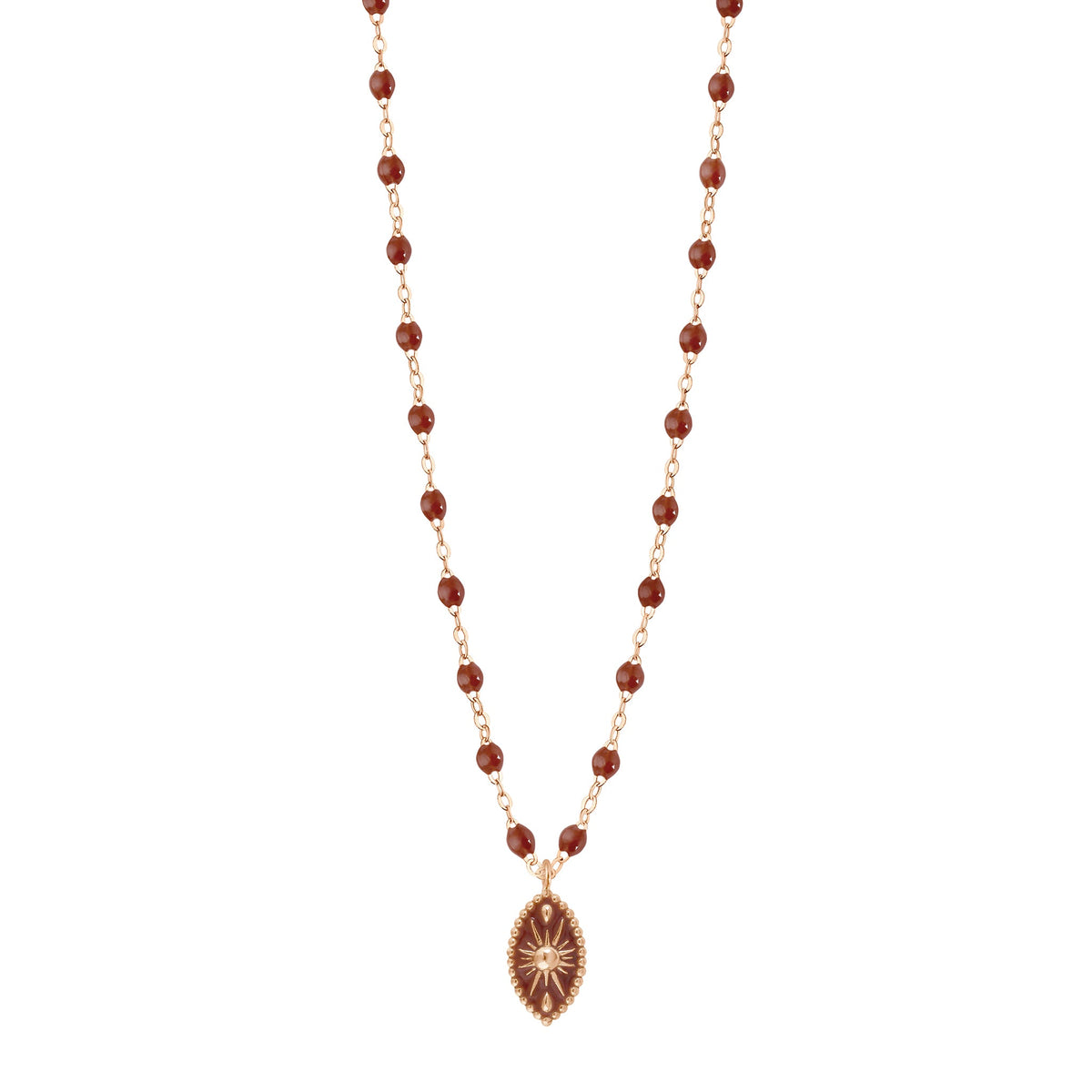 The Gigi Clozeau Karma necklace in 18 carat rose gold on a Classic Gigi chain, with elegant, Moka pearls of resin. The perfectly placed, detailed pendant is a precious talisman, offering light and protection.