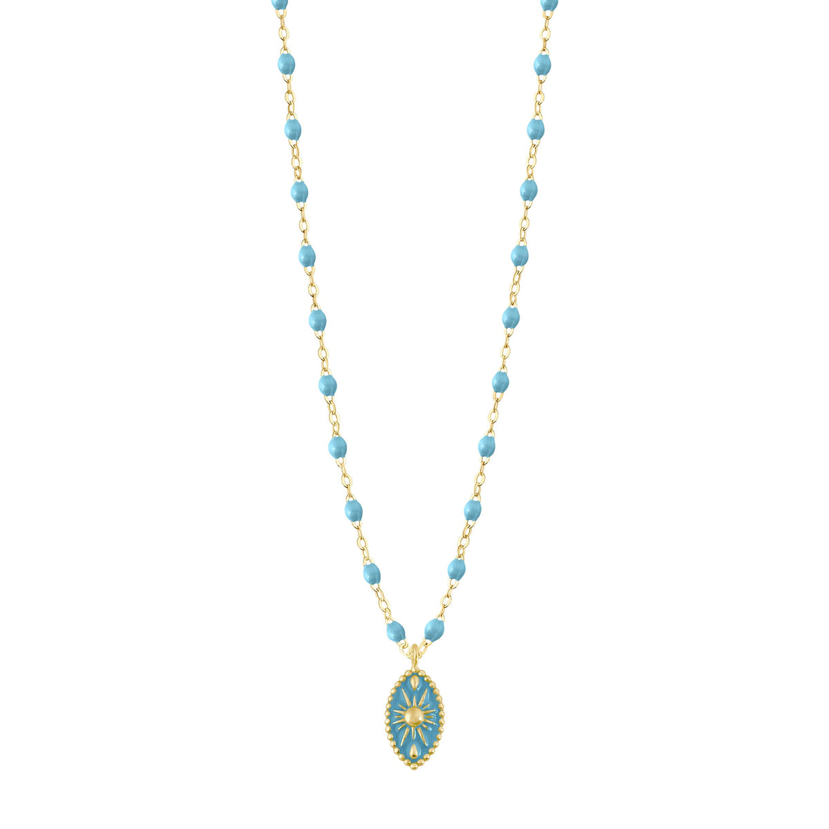 The Gigi Clozeau Karma necklace in 18 carat yellow gold on a Classic Gigi chain, with elegant, Turquoise pearls of resin. The perfectly placed, detailed pendant is a precious talisman, offering light and protection.