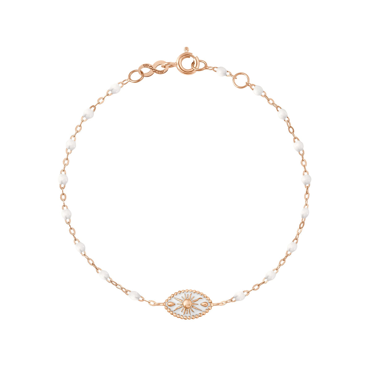 The Gigi Clozeau Karma bracelet in 18 carat rose gold on a Classic Gigi chain, with elegant, White pearls of resin. The perfectly placed, detailed pendant is a precious talisman, offering light and protection.