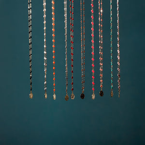 • 16.5" with a 15.7" fastening ring (standard size) • 17.7" with a 17" fastening ring. • 19.7" with a 18.9" fastening ring. • 21.7" with a 20.8" fastening ring. • 23.6" long necklace with a 23" fastening ring. • 34" long necklace