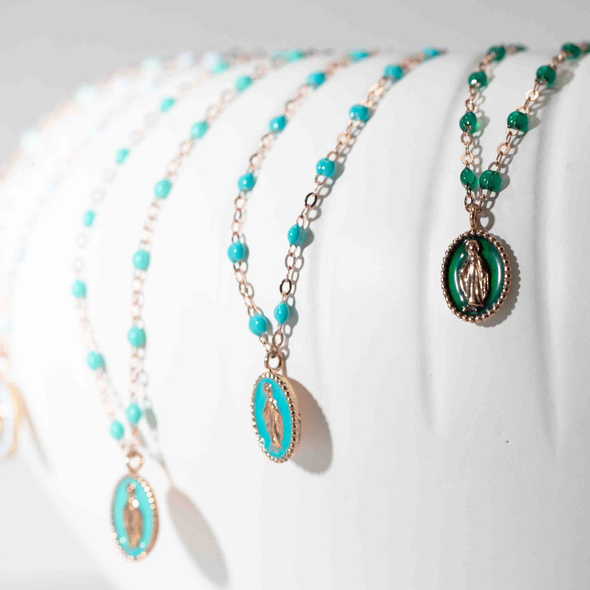 The Classic Gigi Resin Madone necklace by gigi CLOZEAU is a colorful reimagining of ancient symbols with an elegant modern feel. This piece features 18 carat gold, elegant resin pearls and handcrafted detail.